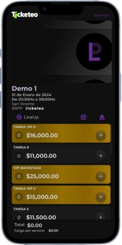 Una vez que el evento está configurado, los organizadores y adminstradores tendran un link con acceso a la compra de entradas. Los asistentes pueden comprar entradas usando el metodo de pago elegido por la organizacion. Cada entrada se emite con un código QR único para su validación.